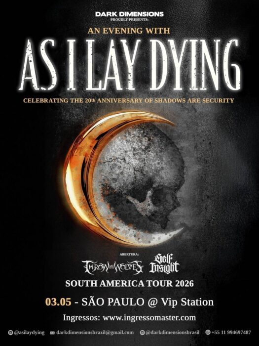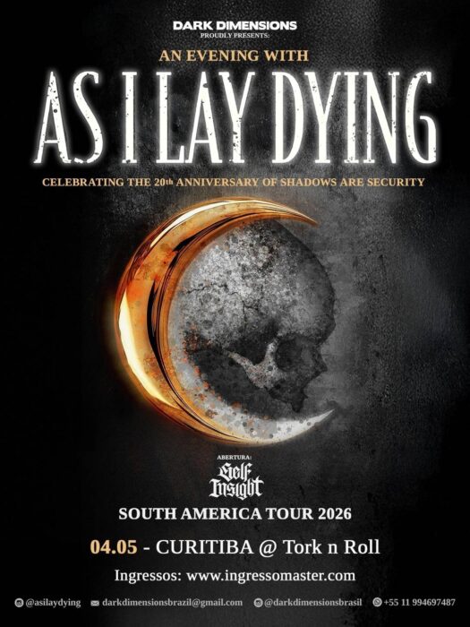 A um mês dos dois shows confirmados no Brasil — em São Paulo (03/05, Vip Station) e Curitiba (04/05, Tork N’ Roll), com realização da produtora Dark Dimensions e ingressos disponíveis pela plataforma Ingresso Master (https://ingressomaster.com) —, a As I Lay Dying inicia um novo capítulo de sua trajetória, marcado por reconstrução, reposicionamento e tentativa de reafirmação dentro do cenário global. A passagem pelo país integra a turnê sul-americana “An Evening With As I Lay Dying”, que também contempla datas em Lima, Peru (27/04), Santiago, Chile (29/04) e Buenos Aires, Argentina (01/05), consolidando o giro como um dos mais aguardados do metalcore em 2026.