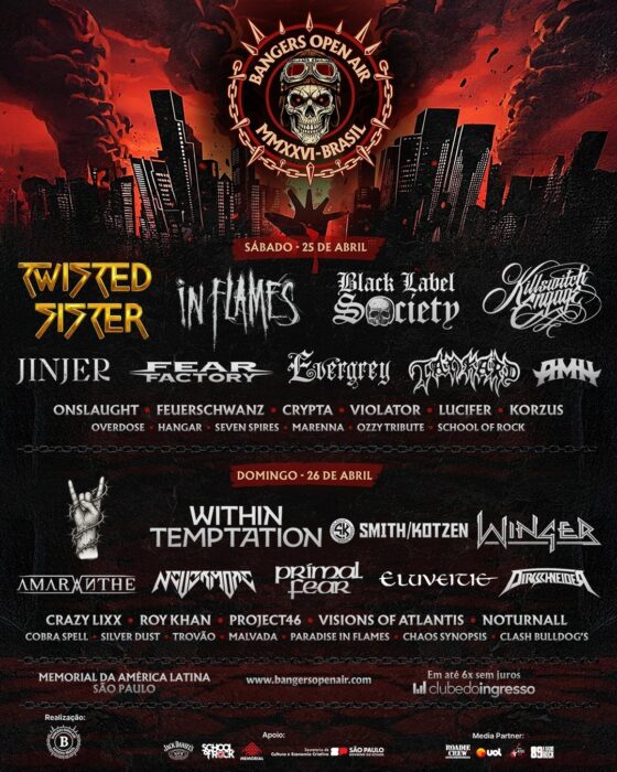 O Bangers Open Air 2026 anuncia o line-up da edição que será realizada nos dias 25 e 26 de abril no Memorial da América Latina, em São Paulo (SP). Alguns dos primeiros nomes divulgados foram BLACK LABEL SOCIETY, PRIMAL FEAR, TANKARD, FEUERSCHWANZ, KORZUS, NEVERMORE, PROJECT46, WITHIN TEMPTATION e CRYPTA. Entre as atrações recém divulgadas, estão KILLSWITCH ENGAGE, JINJER, e o tão requisitado pelo público IN FLAMES. Também foram confirmadas as presenças de WINGER, FEAR FACTORY, ONSLAUGHT, EVERGREY, ELUVEITIE, AMARANTHE, DIRKSCHNEIDER, LUCIFER, COBRA SPELL, CRAZY LIXX, ROY KHAN, SEVEN SPIRES, VISIONS OF ATLANTIS, SILVER DUST, e SMITH/KOTZEN, de Adrian Smith (Iron Maiden) e Richie Kotzen.